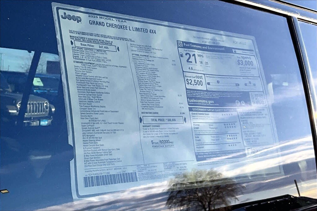 Lithia Chrysler Dodge Jeep Ram of Tri-Cities is pleased to offer this Diamond Black Crystal Pearlcoat 2025 Jeep Grand Cherokee L Limited for purchase, this vehicle is well equipped with many features including:Black Appearance Package (Gloss Black Exterior Accents and Wheels: 20 x 8.5 Gloss Black Painted Aluminum), Luxury Tech Group II (2nd Row Manual Window Shades, Auto-Dimming Exterior Driver Mirror, Capri Leatherette with Axis II Seats, Integrated Off-Road Camera, Intersection Collision Assist System, Memory Steering Column, ParkSense Front/Rear Park Assist with Stop, Passive Entry - Front/Rear Doors, Liftgate, Power Tilt/Telescope Steering Column, Rain Sensitive Windshield Wipers, Rear Back Up Camera Washer, Rearview Autodim Digital Display Mirror, Surround View Camera System, Ventilated Front Seats, and Wireless Charging Pad), Quick Order Package 22E, 3.45 Rear Axle Ratio, 3rd row seats: split-bench, 4-Wheel Disc Brakes, 506 Watt Amplifier, 6 Speakers, 9 Amplified Speakers with Subwoofer, ABS brakes, Active Noise Control System, Air Conditioning, Alloy wheels, AM/FM radio: SiriusXM with 360L, Anti-whiplash front head restraints, Audio memory, Auto High-beam Headlights, Automatic temperature control, Brake assist, Bumpers: body-color, Capri Leatherette Seats, Compass, Delay-off headlights, Driver door bin, Driver vanity mirror, Dual front impact airbags, Dual front side impact airbags, Dual-Pane Panoramic Sunroof, Electronic Stability Control, Emergency communication system, Four wheel independent suspension, Front anti-roll bar, Front Bucket Seats, Front Center Armrest w/Storage, Front dual zone A/C, Front fog lights, Front License Plate Bracket, Front reading lights, Fully automatic headlights, Garage door transmitter, Heated door mirrors, Heated front seats, Heated rear seats, Heated steering wheel, Illuminated entry, Interior Rear Facing Camera, Knee airbag, Low tire pressure warning, Manual Fold Seatbacks, Memory seat, Model Year Tracking, Navigation System, Normal Duty Suspension, Occupant sensing airbag, Outside temperature display, Overhead airbag, Overhead console, Panic alarm, ParkView Rear Back-Up Camera, Passenger door bin, Passenger vanity mirror, Power door mirrors, Power driver seat, Power Liftgate, Power passenger seat, Power steering, Power windows, Radio data system, Radio: Uconnect 5 Nav with 10.1 Display, Rear air conditioning, Rear anti-roll bar, Rear reading lights, Rear window defroster, Rear window wiper, Reclining 3rd row seat, Remote keyless entry, Security system, Speed control, Speed-Sensitive Wipers, Split folding rear seat, Spoiler, Steering wheel mounted audio controls, Tachometer, Telescoping steering wheel, Tilt steering wheel, Traction control, Trip computer, Turn signal indicator mirrors, Variably intermittent wipers, Voltmeter, and Wheels: 18 x 8.0 Polished/Painted Aluminum.