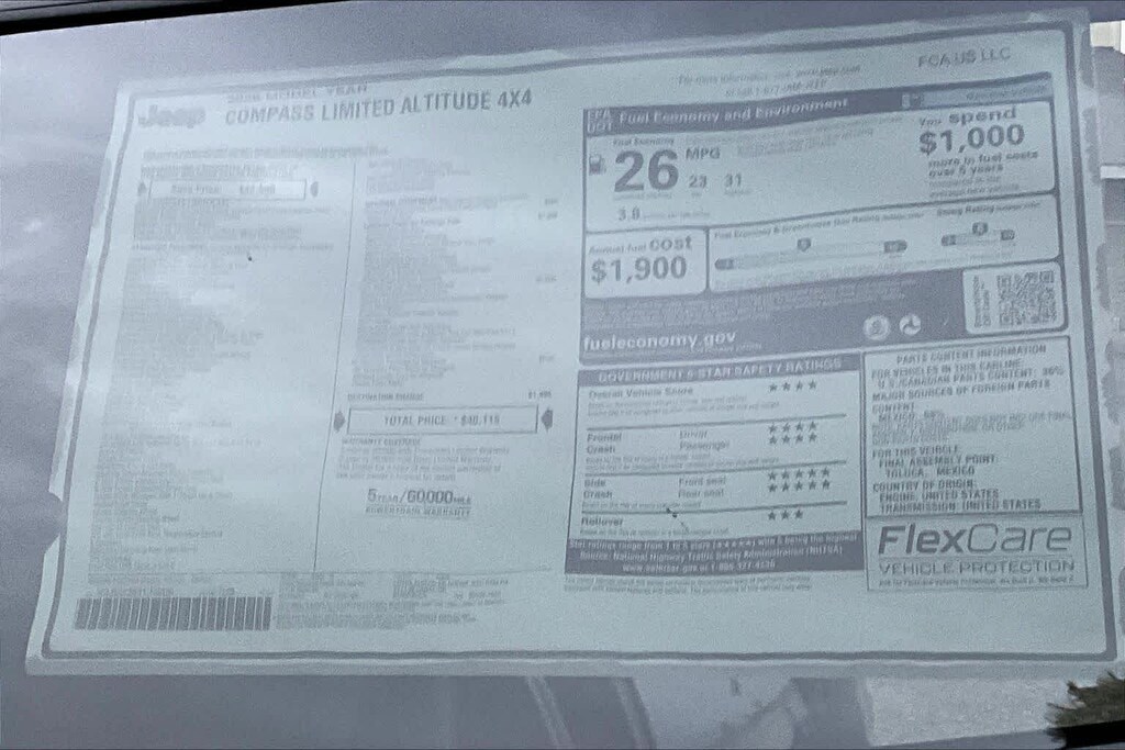 Lithia Chrysler Dodge Jeep Ram of Tri-Cities is pleased to offer this Diamond Black Crystal Pearlcoat 2026 Jeep Compass Limited for purchase, this vehicle is well equipped with many features including:Limited Altitude Pack (Black Day Light Opening Moldings, Gloss Black Surround/Neutral Gray Rings, Neutral Gray Exterior Accents, Neutral Gray Exterior Badging, Piano Black Interior Accents, and Wheels: 19 x 7.5 Aluminum Painted), MOPAR All Weather Package (MOPAR All-Weather Floor Mats and MOPAR Molded Cargo Tray), Quick Order Package 29W Limited Altitude, Sun, Sound and Navigation Group (10.1 Touchscreen Display, Alexa Built-In, Cluster 10.25 TFT Color Display, Connected Travel and Traffic Services, GPS Navigation, HD Radio, Integrated Voice Command with Bluetooth, Power Front/Fixed Rear Full Sunroof, Premium Alpine Speaker System, and SiriusXM with 360L), 4WD, 3.73 Final Drive Ratio, 4-Wheel Disc Brakes, 4G LTE Wi-Fi Hot Spot, 6 Speakers, ABS brakes, Air Conditioning, Alloy wheels, AM/FM radio: SiriusXM, Auto High-beam Headlights, Auto-dimming Rear-View mirror, Automatic temperature control, Brake assist, Bumpers: body-color, Compass, Delay-off headlights, Driver door bin, Driver vanity mirror, Dual front impact airbags, Dual front side impact airbags, Electronic Stability Control, Emergency communication system: SiriusXM Guardian, Four wheel independent suspension, Front anti-roll bar, Front Bucket Seats, Front Center Armrest w/Storage, Front dual zone A/C, Front fog lights, Front License Plate Bracket, Front reading lights, Fully automatic headlights, Global Telematics Box Module, Heated door mirrors, Heated front seats, Heated steering wheel, Illuminated entry, Knee airbag, Leather Shift Knob, Leather steering wheel, Leatherette Seats, Low tire pressure warning, Occupant sensing airbag, Outside temperature display, Overhead airbag, Overhead console, Panic alarm, ParkView Rear Back-Up Camera, Passenger door bin, Passenger vanity mirror, Power door mirrors, Power driver seat, Power Liftgate, Power steering, Power windows, Premium audio system: UConnect 5, Radio: Uconnect 5 with 10.1 Display, Rain sensing wipers, Rear anti-roll bar, Rear seat center armrest, Rear window defroster, Rear window wiper, Remote keyless entry, Security system, SiriusXM Guardian - Included Trail (B), SiriusXM Radio Service, Speed control, Split folding rear seat, Spoiler, Steering wheel mounted audio controls, Tachometer, Telescoping steering wheel, Tilt steering wheel, Traction control, Trip computer, Turn signal indicator mirrors, Variably intermittent wipers, and Wheels: 18 x 7 Painted Diamond Cut Aluminum. 23/31 City/Highway MPG