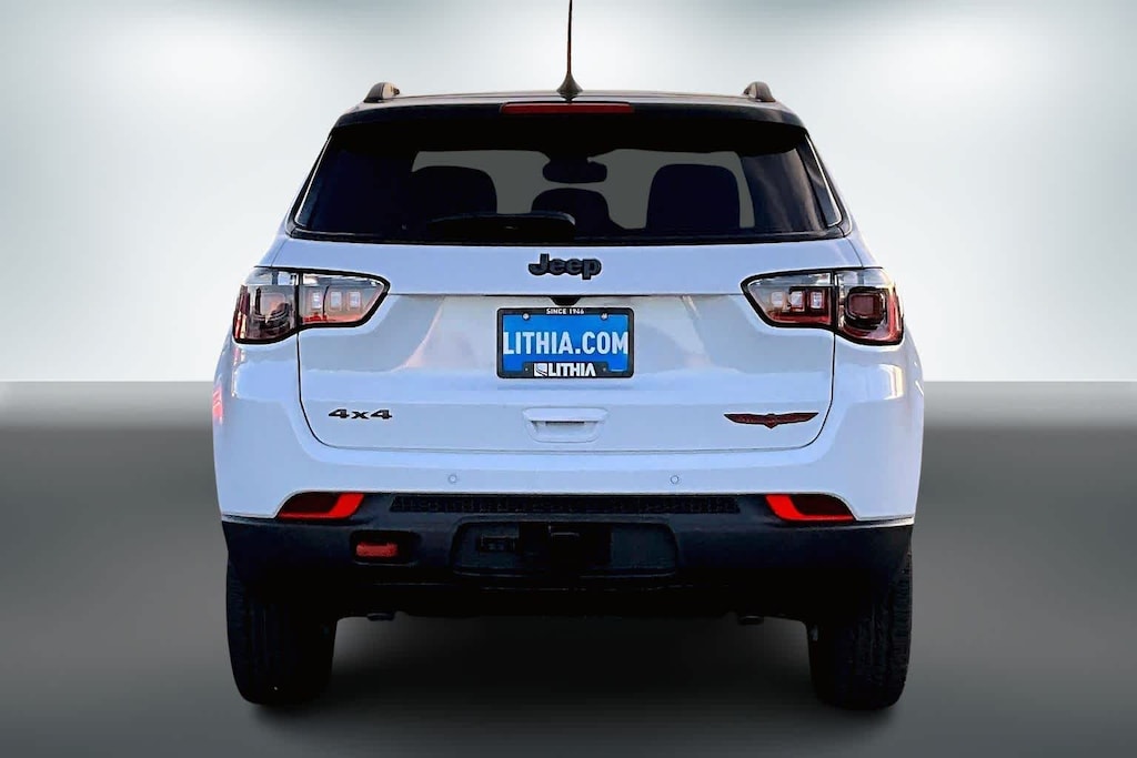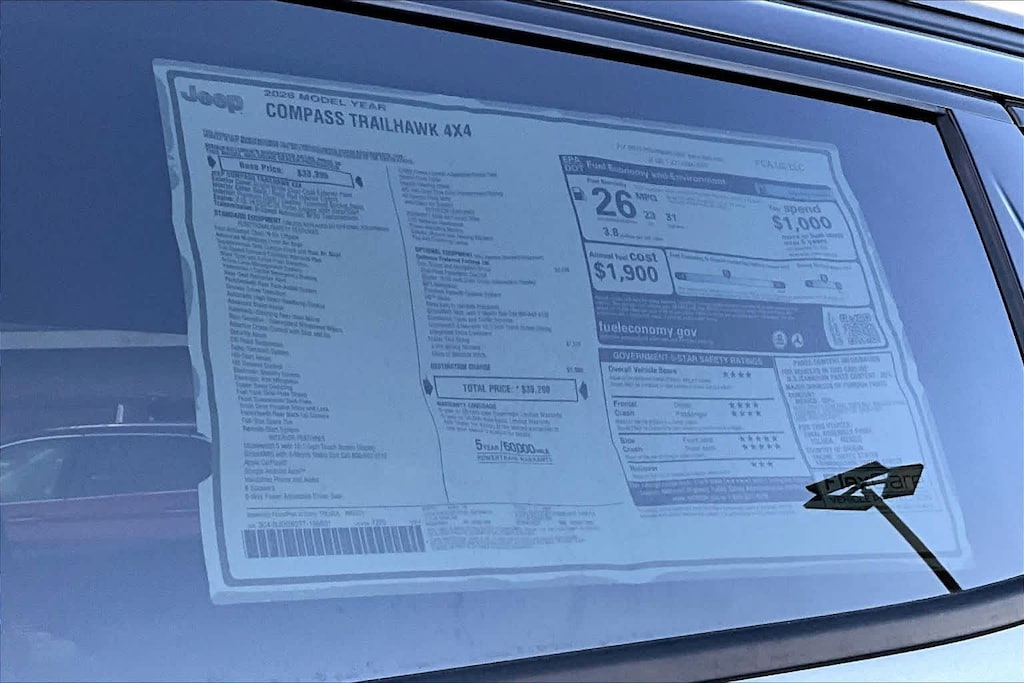 Lithia Chrysler Dodge Jeep Ram of Tri-Cities is pleased to offer this Bright White Clearcoat 2026 Jeep Compass Trailhawk for purchase, this vehicle is well equipped with many features including:Quick Order Package 29E, Sun, Sound and Navigation Group (10.1 Touchscreen Display, Alexa Built-In, Cluster 10.25 TFT Color Display, Connected Travel and Traffic Services, GPS Navigation, HD Radio, Integrated Voice Command with Bluetooth, Power Front/Fixed Rear Full Sunroof, Premium Alpine Speaker System, and SiriusXM with 360L), Trailer Tow Group (4 Pin Wiring Harness and Class III Receiver Hitch), 4WD, 4-Wheel Disc Brakes, 4.398 Final Drive Ratio, 4G LTE Wi-Fi Hot Spot, 6 Speakers, ABS brakes, Air Conditioning, Alloy wheels, AM/FM radio: SiriusXM, Auto High-beam Headlights, Auto-dimming Rear-View mirror, Automatic temperature control, Brake assist, Bumpers: body-color, Compass, Delay-off headlights, Driver door bin, Driver vanity mirror, Dual front impact airbags, Dual front side impact airbags, Electronic Stability Control, Emergency communication system: SiriusXM Guardian, Four wheel independent suspension, Front anti-roll bar, Front Bucket Seats, Front Center Armrest w/Storage, Front dual zone A/C, Front fog lights, Front License Plate Bracket, Front reading lights, Fully automatic headlights, Global Telematics Box Module, Heated door mirrors, Heated front seats, Heated steering wheel, Illuminated entry, Knee airbag, Leather Shift Knob, Leather steering wheel, Low tire pressure warning, Occupant sensing airbag, Outside temperature display, Overhead airbag, Overhead console, Panic alarm, ParkView Rear Back-Up Camera, Passenger door bin, Passenger vanity mirror, Power door mirrors, Power driver seat, Power Liftgate, Power steering, Power windows, Premium audio system: UConnect 5, Premium Cloth/Leather Trim Bucket Seats, Radio: Uconnect 5 with 10.1 Display, Rain sensing wipers, Rear anti-roll bar, Rear seat center armrest, Rear window defroster, Rear window wiper, Remote keyless entry, Security system, SiriusXM Guardian - Included Trail (B), SiriusXM Radio Service, Speed control, Split folding rear seat, Spoiler, Steering wheel mounted audio controls, Tachometer, Telescoping steering wheel, Tilt steering wheel, Traction control, Trip computer, Turn signal indicator mirrors, Variably intermittent wipers, and Wheels: 17 x 6.5 Painted Black Aluminum. 23/31 City/Highway MPG