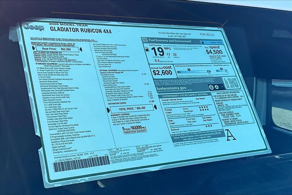 Lithia Chrysler Dodge Jeep Ram of Tri-Cities is pleased to offer this Bright White Clearcoat 2026 Jeep Gladiator Rubicon for purchase, this vehicle is well equipped with many features including:Convenience Group (Heated Front Seats, Heated Steering Wheel, Remote Start System, and Universal Garage Door Opener), Quick Order Package 24R Rubicon, Safety Group (Auto High Beam Headlamp Control, Blind Spot and Cross Path Detection, and ParkSense Rear Park Assist System), Steel Power Dome Hood Package (Power Dome Dual Vented Hood), 110 Mph Vehicle Max Speed Calibration, 12.3 Touchscreen Display, 4-Wheel Disc Brakes, 4.10 Rear Axle Ratio, 4G LTE Wi-Fi Hot Spot, 8 Speakers, ABS brakes, Air Conditioning, Alexa Built-in, Alloy wheels, AM/FM radio: SiriusXM with 360L, Apple CarPlay, Apple CarPlay/Android Auto, Automatic temperature control, Black 3-Piece Hard Top, Brake assist, Cloth Low-Back Bucket Seats, Compass, Connectivity - US/Canada, Delay-off headlights, Driver door bin, Driver vanity mirror, Dual front impact airbags, Dual front side impact airbags, Electronic Stability Control, Emergency communication system: Jeep Connect, Freedom Panel Storage Bag, Front anti-roll bar, Front Bucket Seats, Front Center Armrest w/Storage, Front dual zone A/C, Front fog lights, Front License Plate Bracket, Front reading lights, Fully automatic headlights, Google Android Auto, Heated door mirrors, Illuminated entry, Integrated roll-over protection, Low tire pressure warning, Manufacturers Statement of Origin, MOPAR All-Weather Slush Mats, MOPAR Spray in Bedliner, Occupant sensing airbag, Outside temperature display, Overhead airbag, Panic alarm, Passenger door bin, Passenger vanity mirror, Performance Suspension, Power door mirrors, Power steering, Power windows, Radio data system, Radio: Uconnect 5 with 12.3 Display, Rear anti-roll bar, Rear reading lights, Rear Sliding Window, Rear Window Defroster, Remote keyless entry, Security system, Speed control, Split folding rear seat, Steering wheel mounted audio controls, Tachometer, Telescoping steering wheel, Tilt steering wheel, Traction control, Trip computer, USB Host Flip, Variably intermittent wipers, Voltmeter, Wheels: 17 x 7.5 Machined with Black Pockets, and Wheels: 17 x 7.5 Machined/Painted Black.