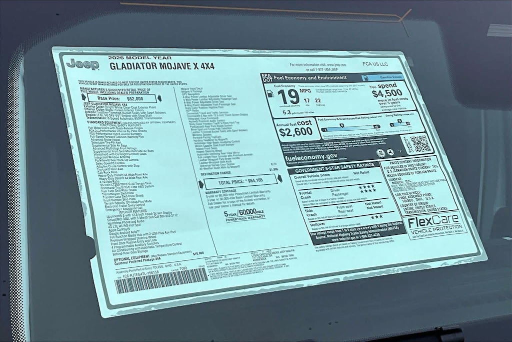 Lithia Chrysler Dodge Jeep Ram of Tri-Cities is pleased to offer this Bright White Clearcoat 2026 Jeep Gladiator Mojave for purchase, this vehicle is well equipped with many features including:Quick Order Package 24A Mojave X (Alpine Premium Audio System, Auto High Beam Headlamp Control, Auto-Dimming Rear-View Mirror, Blind Spot and Cross Path Detection, Bluetooth Wireless Speaker, Body Color 3-Piece Hard Top, Body Color Rubicon Highline Flare, Freedom Panel Storage Bag, Full Length Floor Console Premium Armrest, Heated Front Seats, Heated Steering Wheel, Integrated Off-Road Camera, Integrated Voice Command with Bluetooth, Leather Trimmed Bucket Seats, Leather Wrapped Park Brake Handle, Leather Wrapped Shift Knob, Mojave Top Hood Decal, MOPAR Hardtop Headliner, ParkSense Rear Park Assist System, Power 4-Way Driver Lumbar Adjust, Power 4-Way Passenger Lumbar Adjust, Power Adjust 8-Way Driver Seat, Power Adjust 8-Way Front Passenger Seat, Premium Door Trim Panel, Radio: Uconnect 5 Navigation with 12.3 Display, Rear Armrest with Cupholder Seat, Rear Sliding Window, Rear Window Defroster, Steel Front Bumper, Steel Rear Bumper, Universal Garage Door Opener, and USB Host Flip), 110 Mph Vehicle Max Speed Calibration, 12.3 Touchscreen Display, 4-Wheel Disc Brakes, 4.10 Rear Axle Ratio, 4G LTE Wi-Fi Hot Spot, 8 Speakers, ABS brakes, Air Conditioning, Alexa Built-in, Alloy wheels, AM/FM radio: SiriusXM with 360L, Apple CarPlay, Apple CarPlay/Android Auto, Automatic temperature control, Brake assist, Compass, Connectivity - US/Canada, Delay-off headlights, Driver door bin, Driver vanity mirror, Dual front impact airbags, Dual front side impact airbags, Electronic Stability Control, Emergency communication system: Jeep Connect, Front anti-roll bar, Front Bucket Seats, Front Center Armrest w/Storage, Front dual zone A/C, Front fog lights, Front License Plate Bracket, Front reading lights, Fully automatic headlights, Google Android Auto, Heated door mirrors, Heavy Duty Suspension with Gas Shocks, Illuminated entry, Integrated roll-over protection, Low tire pressure warning, Manufacturers Statement of Origin, MOPAR All-Weather Slush Mats, Occupant sensing airbag, Outside temperature display, Overhead airbag, Panic alarm, Passenger door bin, Passenger vanity mirror, Power door mirrors, Power steering, Power windows, Premium Cloth Seats with Sport Bolsters, Radio data system, Radio: Uconnect 5 with 12.3 Display, Rear anti-roll bar, Rear reading lights, Remote keyless entry, Security system, Speed control, Split folding rear seat, Steering wheel mounted audio controls, Tachometer, Telescoping steering wheel, Tilt steering wheel, Traction control, Trip computer, Variably intermittent wipers, Voltmeter, and Wheels: 17 x 7.5 Dark Gray Painted.