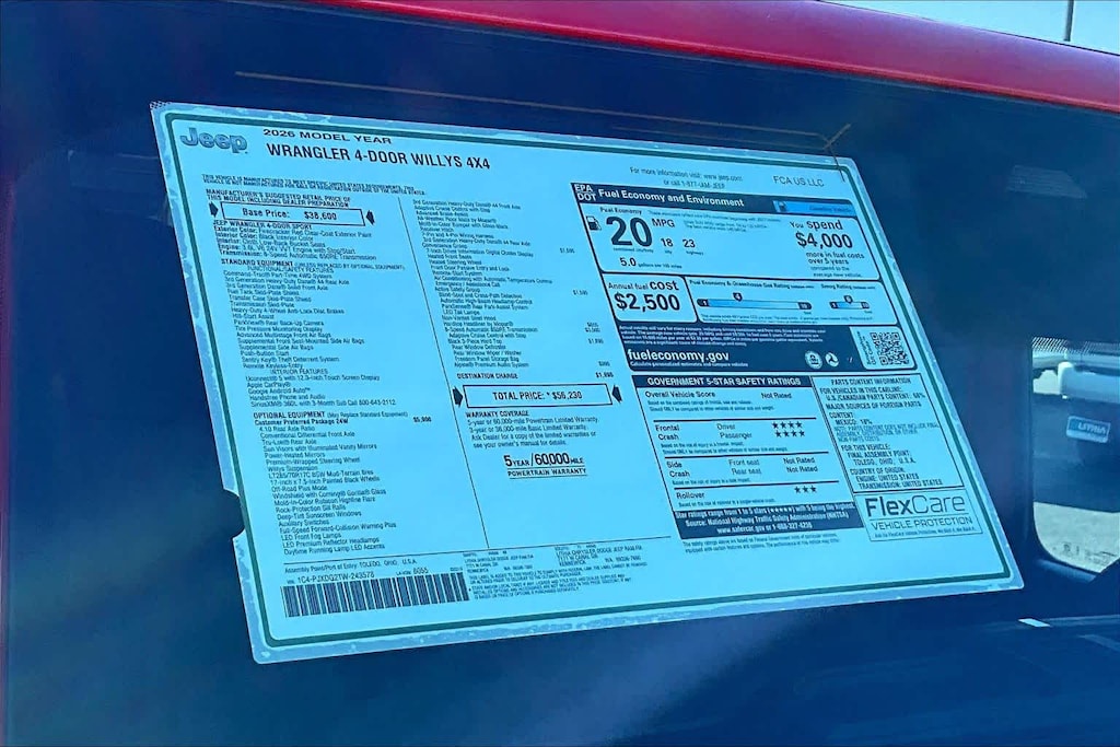 Lithia Chrysler Dodge Jeep Ram of Tri-Cities is pleased to offer this Firecracker Red Clearcoat 2026 Jeep Wrangler Willys for purchase, this vehicle is well equipped with many features including:Convenience Group (2-Door Passive Entry, Front Door Locks, Air Conditioning with Auto Temp Control, Air Filtering, Cluster 7.0 TFT Color Display, Emergency/Assistance Call, Heated Front Seats, Heated Steering Wheel, and Universal Garage Door Opener), Quick Order Package 24W Willys (4-Wheel Drive Swing Gate Decal, 7 and 4 Pin Wiring Harness, Advanced Brake Assist, Automatic Headlamps, Auxiliary Switches, Black Grille with Gloss Black Rings, Class II Receiver Hitch, Conventional Differential Front Axle, Corning Gorilla Glass, Dana M210 Wide HD Tube Front Axle, Dana M220 Wide Rear Axle, Daytime Running Lamps LED Accents, Deep Tint Sunscreen Windows, E-Locker Rear Axle, Enhanced Adaptive Cruise Control, Front LED Fog Lamps, Full Speed Forward Collision Warning Plus, Increased Travel Export Tuned Suspension, Injection Molded Black Rear Bumper, LED Premium Reflector Headlamps, Mold in Color Bumper with Gloss Black, Molded in Color Rubicon Highline Flare, MOPAR All-Weather Floor Mats, Off-Road Plus Mode, Power Heated Mirrors, Premium Wrapped Steering Wheel, Security Alarm, Sun Visors with Illuminated Vanity Mirrors, Wheels: 17 x 7.5 Painted Black, and Willys Hood Decal), Safety Group (Auto High Beam Headlamp Control, Blind Spot and Cross Path Detection, LED Taillamps, and ParkSense Rear Park Assist System), 12.3 Touchscreen Display, 4-Wheel Disc Brakes, 4G LTE Wi-Fi Hot Spot, 8 Speakers, ABS brakes, Air Conditioning, Alpine Premium Audio System, AM/FM radio: SiriusXM with 360L, Apple CarPlay, Apple CarPlay/Android Auto, Aux Battery, Black 3-Piece Hard Top, Brake assist, Compass, Connectivity - US/Canada, Delay-off headlights, Driver door bin, Driver vanity mirror, Dual front impact airbags, Dual front side impact airbags, Electronic Stability Control, For More Info, Call 800-643-2112, Freedom Panel Storage Bag, Front anti-roll bar, Front Bucket Seats, Front Center Armrest w/Storage, Front fog lights, Front reading lights, Google Android Auto, Illuminated entry, Integrated Center Stack Radio, Integrated roll-over protection, Low tire pressure warning, Manufacture Statement of Origin, MOPAR Hardtop Headliner, No Soft Top, Non-Lock Fuel Cap Without Discriminator, Normal Duty Suspension, Occupant sensing airbag, Outside temperature display, Overhead airbag, Panic alarm, ParkView Rear Back-Up Camera, Passenger door bin, Passenger vanity mirror, Power steering, Power windows, Radio data system, Radio: Uconnect 5 with 12.3 Display, Rear anti-roll bar, Rear reading lights, Rear Window Defroster, Rear Window Wiper/Washer, Remote keyless entry, SiriusXM Radio Service, SiriusXM with 360L, Speed control, Split folding rear seat, Steering wheel mounted audio controls, Stop-Start Dual Battery System, Tachometer, Telescoping steering wheel, Tilt steering wheel, Traction control, Trip computer, Variably intermittent wipers, and Wheels: 17 x 7.5 Black Steel Styled.