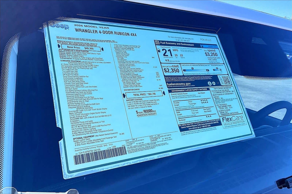 Lithia Chrysler Dodge Jeep Ram of Tri-Cities is pleased to offer this Bright White Clearcoat 2026 Jeep Wrangler Rubicon for purchase, this vehicle is well equipped with many features including:Convenience Group (Heated Front Seats, Heated Steering Wheel, and Universal Garage Door Opener), Quick Order Package 22R Rubicon, Safety Group (Auto High Beam Headlamp Control, Blind Spot and Cross Path Detection, and ParkSense Rear Park Assist System), Steel Performance Hood Package (Performance Hood), Technology Group (12.3 Touchscreen Display, 4G LTE Wi-Fi Hot Spot, Apple CarPlay, Auto-Dimming Rear-View Mirror, Connected Travel and Traffic Services, Connectivity - US/Canada, For More Info, Call 800-643-2112, Google Android Auto, GPS Navigation, HD Radio, Integrated Center Stack Radio, Integrated Off-Road Camera, Integrated Voice Command with Bluetooth, Radio: Uconnect 5 Navigation with 12.3 Display, SiriusXM Radio Service, and SiriusXM with 360L), 4-Wheel Disc Brakes, 4.10 Rear Axle Ratio, 8 Speakers, ABS brakes, Air Conditioning, Alloy wheels, Alpine Premium Audio System, AM/FM radio: SiriusXM with 360L, Apple CarPlay/Android Auto, Automatic temperature control, Aux Battery, Auxiliary Switches, Body Color 3-Piece Hard Top, Brake assist, Class II Receiver Hitch, Cloth Low-Back Bucket Seats, Compass, Delay-off headlights, Driver door bin, Driver vanity mirror, Dual front impact airbags, Dual front side impact airbags, Electronic Stability Control, Emergency communication system: Jeep Connect, Freedom Panel Storage Bag, Front anti-roll bar, Front Bucket Seats, Front Center Armrest w/Storage, Front dual zone A/C, Front fog lights, Front License Plate Bracket, Front reading lights, Fully automatic headlights, Heated door mirrors, Illuminated entry, Integrated roll-over protection, Low tire pressure warning, MOPAR All-Weather Floor Mats, MOPAR Hardtop Headliner, No Soft Top, Non-Lock Fuel Cap Without Discriminator, Occupant sensing airbag, Outside temperature display, Overhead airbag, Panic alarm, ParkView Rear Back-Up Camera, Passenger door bin, Passenger vanity mirror, Performance Suspension, Power door mirrors, Power steering, Power windows, Radio data system, Radio: Uconnect 5 with 12.3 Display, Rear anti-roll bar, Rear reading lights, Rear Window Defroster, Rear Window Wiper/Washer, Remote keyless entry, Security system, Speed control, Split folding rear seat, Steering wheel mounted audio controls, Stop-Start Dual Battery System, Tachometer, Telescoping steering wheel, Tilt steering wheel, Traction control, Trip computer, Variably intermittent wipers, Voltmeter, and Wheels: 17 x 7.5 Machined/Painted Black.