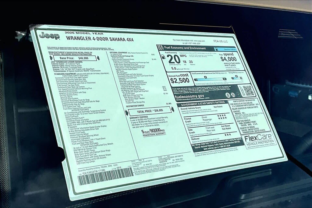 Lithia Chrysler Dodge Jeep Ram of Tri-Cities is pleased to offer this 41 2026 Jeep Wrangler Sahara for purchase, this vehicle is well equipped with many features including:Quick Order Package 24G, Sahara Popular Equipment Group (12.3 Touchscreen Display, 4G LTE Wi-Fi Hot Spot, Alpine Premium Audio System, Apple CarPlay, Auto High Beam Headlamp Control, Auto-Dimming Rear-View Mirror, Blind Spot & Cross Path Detection, Connected Travel & Traffic Services, Connectivity - US/Canada, For More Info, Call 800-643-2112, Google Android Auto, GPS Navigation, Hard Seat Back, HD Radio, Integrated Center Stack Radio, Integrated Off-Road Camera, Integrated Voice Command w/Bluetooth, Leather Wrapped Park Brake Handle, Leather Wrapped Shift Knob, McKinley Trimmed Seats, ParkSense Rear Park Assist System, Power 4-Way Driver Lumbar Adjust, Power 4-Way Passenger Lumbar Adjust, Power Adjust 8-Way Driver Seat, Power Adjust 8-Way Front Passenger Seat, Radio: Uconnect 5 Nav w/12.3 Display, Side Steps, SiriusXM Radio Service, SiriusXM w/360L, and Universal Garage Door Opener), 3.45 Overall Top Gear Ratio, 4-Wheel Disc Brakes, 8 Speakers, ABS brakes, Air Conditioning, Alloy wheels, AM/FM radio: SiriusXM with 360L, Apple CarPlay/Android Auto, Automatic temperature control, Aux Battery, Body Color 3-Piece Hard Top, Brake assist, Cloth Low-Back Bucket Seats, Compass, Delay-off headlights, Driver door bin, Driver vanity mirror, Dual front impact airbags, Dual front side impact airbags, Electronic Stability Control, Emergency communication system: Jeep Connect, Freedom Panel Storage Bag, Front anti-roll bar, Front Bucket Seats, Front Center Armrest w/Storage, Front dual zone A/C, Front fog lights, Front License Plate Bracket, Front reading lights, Fully automatic headlights, Heated door mirrors, Heated front seats, Heated steering wheel, Heavy Duty Suspension w/Gas Shocks, Illuminated entry, Integrated roll-over protection, Low tire pressure warning, MOPAR All-Weather Floor Mats, MOPAR Hardtop Headliner, No Soft Top, Non-Lock Fuel Cap w/o Discriminator, Occupant sensing airbag, Outside temperature display, Overhead airbag, Panic alarm, ParkView Rear Back-Up Camera, Passenger door bin, Passenger vanity mirror, Power door mirrors, Power steering, Power windows, Radio data system, Radio: Uconnect 5 w/12.3 Display, Rear anti-roll bar, Rear reading lights, Rear Window Defroster, Rear Window Wiper/Washer, Remote keyless entry, Security system, Speed control, Split folding rear seat, Steering wheel mounted audio controls, Stop-Start Dual Battery System, Tachometer, Telescoping steering wheel, Tilt steering wheel, Traction control, Trip computer, Variably intermittent wipers, Voltmeter, and Wheels: 18 x 7.5 Machine/Painted Gray.