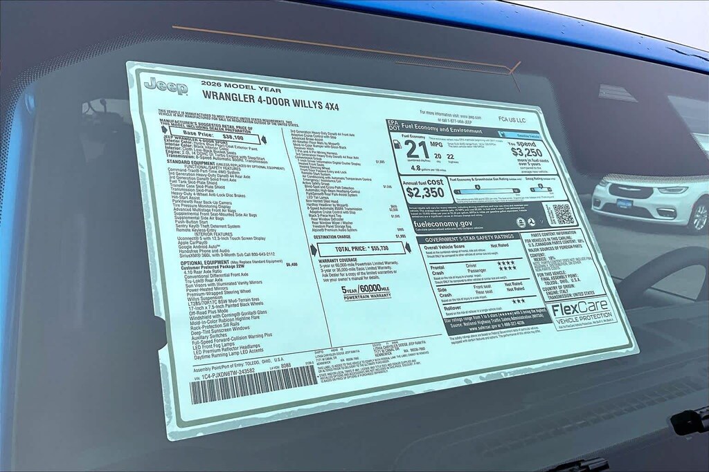 Lithia Chrysler Dodge Jeep Ram of Tri-Cities is pleased to offer this Hydro Blue Pearl Coat 2026 Jeep Wrangler Willys for purchase, this vehicle is well equipped with many features including:Convenience Group (2-Door Passive Entry, Front Door Locks, Air Conditioning with Auto Temp Control, Air Filtering, Cluster 7.0 TFT Color Display, Emergency/Assistance Call, Heated Front Seats, Heated Steering Wheel, and Universal Garage Door Opener), Quick Order Package 22W Willys (4-Wheel Drive Swing Gate Decal, 7 and 4 Pin Wiring Harness, Advanced Brake Assist, Automatic Headlamps, Auxiliary Switches, Black Grille with Gloss Black Rings, Class II Receiver Hitch, Conventional Differential Front Axle, Corning Gorilla Glass, Dana M210 Wide HD Tube Front Axle, Dana M220 Wide Rear Axle, Daytime Running Lamps LED Accents, Deep Tint Sunscreen Windows, E-Locker Rear Axle, Enhanced Adaptive Cruise Control, Front LED Fog Lamps, Full Speed Forward Collision Warning Plus, Injection Molded Black Rear Bumper, LED Premium Reflector Headlamps, Mold in Color Bumper with Gloss Black, Molded in Color Rubicon Highline Flare, MOPAR All-Weather Floor Mats, Off-Road Plus Mode, Power Heated Mirrors, Premium Wrapped Steering Wheel, Security Alarm, Sun Visors with Illuminated Vanity Mirrors, Wheels: 17 x 7.5 Painted Black, Willys Suspension, and Willys Hood Decal), Safety Group (Auto High Beam Headlamp Control, Blind Spot and Cross Path Detection, LED Taillamps, and ParkSense Rear Park Assist System), 12.3 Touchscreen Display, 4-Wheel Disc Brakes, 4G LTE Wi-Fi Hot Spot, 8 Speakers, ABS brakes, Air Conditioning, Alpine Premium Audio System, AM/FM radio: SiriusXM with 360L, Apple CarPlay, Apple CarPlay/Android Auto, Aux Battery, Black 3-Piece Hard Top, Brake assist, Compass, Connectivity - US/Canada, Delay-off headlights, Driver door bin, Driver vanity mirror, Dual front impact airbags, Dual front side impact airbags, Electronic Stability Control, For More Info, Call 800-643-2112, Freedom Panel Storage Bag, Front anti-roll bar, Front Bucket Seats, Front Center Armrest w/Storage, Front fog lights, Front reading lights, Google Android Auto, Illuminated entry, Integrated Center Stack Radio, Integrated roll-over protection, Low tire pressure warning, Manufacture Statement of Origin, MOPAR Hardtop Headliner, No Soft Top, Non-Lock Fuel Cap Without Discriminator, Normal Duty Suspension, Occupant sensing airbag, Outside temperature display, Overhead airbag, Panic alarm, ParkView Rear Back-Up Camera, Passenger door bin, Passenger vanity mirror, Power steering, Power windows, Radio data system, Radio: Uconnect 5 with 12.3 Display, Rear anti-roll bar, Rear reading lights, Rear Window Defroster, Rear Window Wiper/Washer, Remote keyless entry, SiriusXM Radio Service, SiriusXM with 360L, Speed control, Split folding rear seat, Steering wheel mounted audio controls, Stop-Start Dual Battery System, Tachometer, Telescoping steering wheel, Tilt steering wheel, Traction control, Trip computer, Variably intermittent wipers, and Wheels: 17 x 7.5 Black Steel Styled.