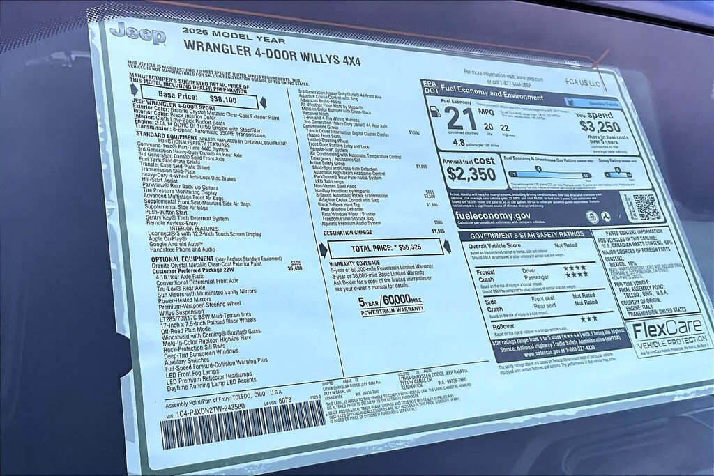 Lithia Chrysler Dodge Jeep Ram of Tri-Cities is pleased to offer this Granite Crystal Metallic Clearcoat 2026 Jeep Wrangler Willys for purchase, this vehicle is well equipped with many features including:Convenience Group (2-Door Passive Entry, Front Door Locks, Air Conditioning with Auto Temp Control, Air Filtering, Cluster 7.0 TFT Color Display, Emergency/Assistance Call, Heated Front Seats, Heated Steering Wheel, and Universal Garage Door Opener), Quick Order Package 22W Willys (4-Wheel Drive Swing Gate Decal, 7 and 4 Pin Wiring Harness, Advanced Brake Assist, Automatic Headlamps, Auxiliary Switches, Black Grille with Gloss Black Rings, Class II Receiver Hitch, Conventional Differential Front Axle, Corning Gorilla Glass, Dana M210 Wide HD Tube Front Axle, Dana M220 Wide Rear Axle, Daytime Running Lamps LED Accents, Deep Tint Sunscreen Windows, E-Locker Rear Axle, Enhanced Adaptive Cruise Control, Front LED Fog Lamps, Full Speed Forward Collision Warning Plus, Increased Travel Export Tuned Suspension, Injection Molded Black Rear Bumper, LED Premium Reflector Headlamps, Mold in Color Bumper with Gloss Black, Molded in Color Rubicon Highline Flare, MOPAR All-Weather Floor Mats, Off-Road Plus Mode, Power Heated Mirrors, Premium Wrapped Steering Wheel, Security Alarm, Sun Visors with Illuminated Vanity Mirrors, Wheels: 17 x 7.5 Painted Black, and Willys Hood Decal), Safety Group (Auto High Beam Headlamp Control, Blind Spot and Cross Path Detection, LED Taillamps, and ParkSense Rear Park Assist System), 12.3 Touchscreen Display, 4-Wheel Disc Brakes, 4G LTE Wi-Fi Hot Spot, 8 Speakers, ABS brakes, Air Conditioning, Alpine Premium Audio System, AM/FM radio: SiriusXM with 360L, Apple CarPlay, Apple CarPlay/Android Auto, Aux Battery, Black 3-Piece Hard Top, Brake assist, Compass, Connectivity - US/Canada, Delay-off headlights, Driver door bin, Driver vanity mirror, Dual front impact airbags, Dual front side impact airbags, Electronic Stability Control, For More Info, Call 800-643-2112, Freedom Panel Storage Bag, Front anti-roll bar, Front Bucket Seats, Front Center Armrest w/Storage, Front fog lights, Front reading lights, Google Android Auto, Illuminated entry, Integrated Center Stack Radio, Integrated roll-over protection, Low tire pressure warning, Manufacture Statement of Origin, MOPAR Hardtop Headliner, No Soft Top, Non-Lock Fuel Cap Without Discriminator, Normal Duty Suspension, Occupant sensing airbag, Outside temperature display, Overhead airbag, Panic alarm, ParkView Rear Back-Up Camera, Passenger door bin, Passenger vanity mirror, Power steering, Power windows, Radio data system, Radio: Uconnect 5 with 12.3 Display, Rear anti-roll bar, Rear reading lights, Rear Window Defroster, Rear Window Wiper/Washer, Remote keyless entry, SiriusXM Radio Service, SiriusXM with 360L, Speed control, Split folding rear seat, Steering wheel mounted audio controls, Stop-Start Dual Battery System, Tachometer, Telescoping steering wheel, Tilt steering wheel, Traction control, Trip computer, Variably intermittent wipers, and Wheels: 17 x 7.5 Black Steel Styled.