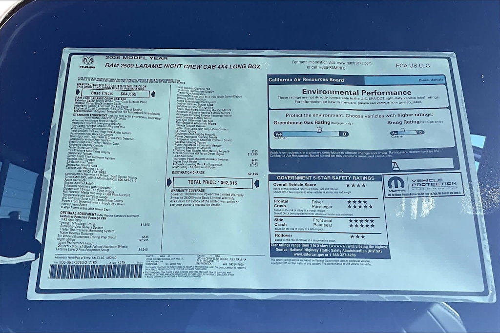 Lithia Chrysler Dodge Jeep Ram of Tri-Cities is pleased to offer this Bright White Clearcoat 2026 Ram 2500 Laramie for purchase, this vehicle is well equipped with many features including:Laramie Level 2 Plus Equipment Group (#1 Seat Foam Cushion, 115V Auxiliary Rear Power Outlet, 14.4 Touchscreen Display, 17 Speaker Harman/Kardon Premium Sound, 2 Way Rear Headrest Seat, 2nd Row in Floor Storage Bins, 4 Way Front Headrests, 4G LTE Wi-Fi Hot Spot, Active Lane Management System, Adaptive Steering System, Alexa Built-in, Anti-Spin Differential Rear Axle, Apple CarPlay, Auto Adjust in Reverse Exterior Mirrors, Auto Dim Exterior Mirror, Auto High Beam Headlamp Control, Auto Power-Folding Mirrors, Auto-Dimming Exterior Passenger Mirror, Bucket Seats, Center Stop Lamp with Cargo View Camera, Chrome Exterior Mirrors, Connected Travel and Traffic Services, Connectivity - US/Canada, Disassociated Touchscreen Display, Drowsy Driver Detection, Dual Wireless Charging Pad, Emergency Vehicle Alert System (EVAS), Exterior Mirrors Courtesy Lamps, Exterior Mirrors with Heating Element, Exterior Mirrors with Memory, Exterior Mirrors with Supplemental Signals, Foam Bottle Insert (door Trim Panel), Folding Flat Load Floor Storage, For Details, Visit DriveUconnect.com, For More Info, Call 800-643-2112, Forward and Reverse Utility Lights, Front Seat Back Map Pockets, Full Length Upgraded Floor Console, Global Telematics Box Module, Google Android Auto, GPS Antenna Input, GPS Navigation, HD Radio, Heated Front Seats, Heated Steering Wheel, High Back Seats, Integrated Voice Command with Bluetooth, Leather Trimmed Bucket Seats, LED Bed Lighting, Mirror Running Lights, MOPAR Deployable Bed Step, MOPAR Spray in Bedliner, Off-Road Info Pages, Power 2-Way Driver Lumbar Adjust, Power 2-Way Passenger Lumbar Adjust, Power Adjust 8-Way Driver Seat, Power Adjust 8-Way Front Passenger Seat, Power Adjust Mirrors, Power Adjustable Pedals with Memory, Power Deployable Running Boards, Power Heated Fold Telescopic Mirrors with Memory, Power Telescoping Mirrors, Power-Adjustable Convex Aux Mirrors, Radio: Uconnect 5 Nav with 14.4 Display, Radio/Driver Seat/Mirrors/Pedals Memory, Rain Sensitive Windshield Wipers, Rear 60/40 Folding Seat, Remote Tailgate Release, Selectable Tire Fill Alert, SiriusXM Radio Service, SiriusXM with 360L, Traffic Sign Recognition, Trailer Tow Pages, and Ventilated Front Seats), Night Edition (Black Exterior Mirrors, Black Exterior Truck Badging, Black Wheel Center Hub, Body Color Grille-Surround, Gloss Black Grille Billets/Accents, Sport Performance Hood, and Wheels: 20 x 8.0 Black Painted Aluminum), Quick Order Package 24H Laramie, Towing Technology Group (Surround View Camera System, Trailer Reverse Guidance, and Trailer Tire Pressure Monitoring System), 10 Speakers, 4-Wheel Disc Brakes, 5th Wheel/Gooseneck Towing Prep Group, ABS brakes, Air Conditioning, Alloy wheels, AM/FM radio: SiriusXM with 360L, Apple CarPlay/Android Auto, Auto Level Rear Air Suspension, Auto-dimming Rear-View mirror, Automatic temperature control, Brake assist, Bumpers: body-color, Compass, Dash Pass Thru Wire Circuits, Delay-off headlights, Driver door bin, Driver vanity mirror, Dual front impact airbags, Dual front side impact airbags, Electronic Stability Control, Engine Block Heater, Front anti-roll bar, Front Center Armrest w/Storage, Front dual zone A/C, Front fog lights, Front License Plate Bracket, Front reading lights, Fully automatic headlights, Garage door transmitter, Heated door mirrors, Heated front seats, Heated steering wheel, Illuminated entry, Instrument Panel Mounted Auxiliary Switches, Leather Trim 40/20/40 Bench Seat, Low tire pressure warning, Manufacturers Statement of Origin, MOPAR Front and Rear Rubber Floor Mats, Navigation System, Occupant sensing airbag, Outside temperature display, Overhea Price includes: $1000 - 2026 National Bonus Cash . Exp. 03/02/2