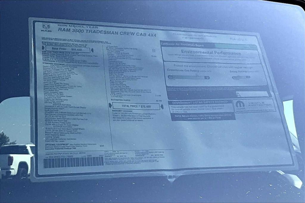 Lithia Chrysler Dodge Jeep Ram of Tri-Cities is pleased to offer this Diamond Black Crystal Pearlcoat 2026 Ram 3500 Tradesman for purchase, this vehicle is well equipped with many features including:Bed Convenience Group (LED Bed Lighting and MOPAR Spray in Bedliner), Quick Order Package 24A Tradesman, Tradesman Level 2 Equipment Group (115-Volt Auxiliary Front Power Outlet, 12 Touchscreen Display, 2 Way Rear Headrest Seat, 4 Way Front Headrests, 40/20/40 Split Bench Seat, 400W Inverter, 4G LTE Wi-Fi Hot Spot, Air Conditioning ATC with Dual Zone Control, Alexa Built-in, Apple CarPlay, Auto-Dimming Rear-View Mirror, Black Exterior Mirrors, Bright Front Bumper, Bright Rear Bumper, Carpet Floor Covering, Center Hub, Chrome Grille Surround, Cloth 40/20/40 Bench Seat, Connected Travel and Traffic Services, Connectivity - US/Canada, Convenience Group, Disassociated Touchscreen Display, Emergency Vehicle Alert System (EVAS), Exterior 115V AC Outlet, Exterior Mirrors Courtesy Lamps, Exterior Mirrors with Heating Element, Exterior Mirrors with Supplemental Signals, For Details Visit DriveUconnect.com, For More Info, Call 800-643-2112, Front and Rear Floor Mats, Front Armrest with Cupholders, Global Telematics Box Module, Google Android Auto, GPS Antenna Input, GPS Navigation, HD Radio, Integrated Voice Command with Bluetooth, Manual Adjust 4-Way Driver Seat, Manual Adjust 4-Way Front Passenger Seat, Manual Folding Exterior Mirrors, Manual Telescoping Mirrors, Matte Black Mesh with Chrome Grille, Mirror Running Lights, Mopar Black Tubular Side Steps, Off-Road Information Pages, ParkSense Front/Rear Park Assist System, Power Adjust Mirrors, Power Heat Fold Telescopic Mirrors, Power-Adjustable Convex Aux Mirrors, Radio: Uconnect 5 Navigation with 12.0 Display, Rear Folding Seat, Rear Power Sliding Window, Remote USB Port - Charge Only, Selectable Tire Fill Alert, SiriusXM Radio Service, SiriusXM with 360L, Storage Tray, Tinted Acoustic Windshield Glass, Trailer Tow Pages, and Wheels: 18 x 8.0 Steel Chrome Clad), 4-Wheel Disc Brakes, 5th Wheel/Gooseneck Towing Prep Group, 6 Speakers, ABS brakes, Air Conditioning, AM/FM radio: SiriusXM, Apple CarPlay/Android Auto, Brake assist, Compass, Delay-off headlights, Driver door bin, Dual front impact airbags, Dual front side impact airbags, Electronic Stability Control, Front anti-roll bar, Front Center Armrest w/Storage, Front fog lights, Front License Plate Bracket, Front reading lights, Fully automatic headlights, Illuminated entry, Low tire pressure warning, Manufacturers Statement of Origin, Occupant sensing airbag, Outside temperature display, Overhead airbag, Overhead console, Panic alarm, ParkView Rear Back-Up Camera, Passenger door bin, Passenger vanity mirror, Power steering, Power windows, Radio data system, Radio: Uconnect 5 with 8.4 Display, Rear step bumper, Rear window defroster, Remote keyless entry, Speed control, Tachometer, Tilt steering wheel, Traction control, Variably intermittent wipers, Voltmeter, and Wheels: 18 x 8.0 Black Painted SteeL.