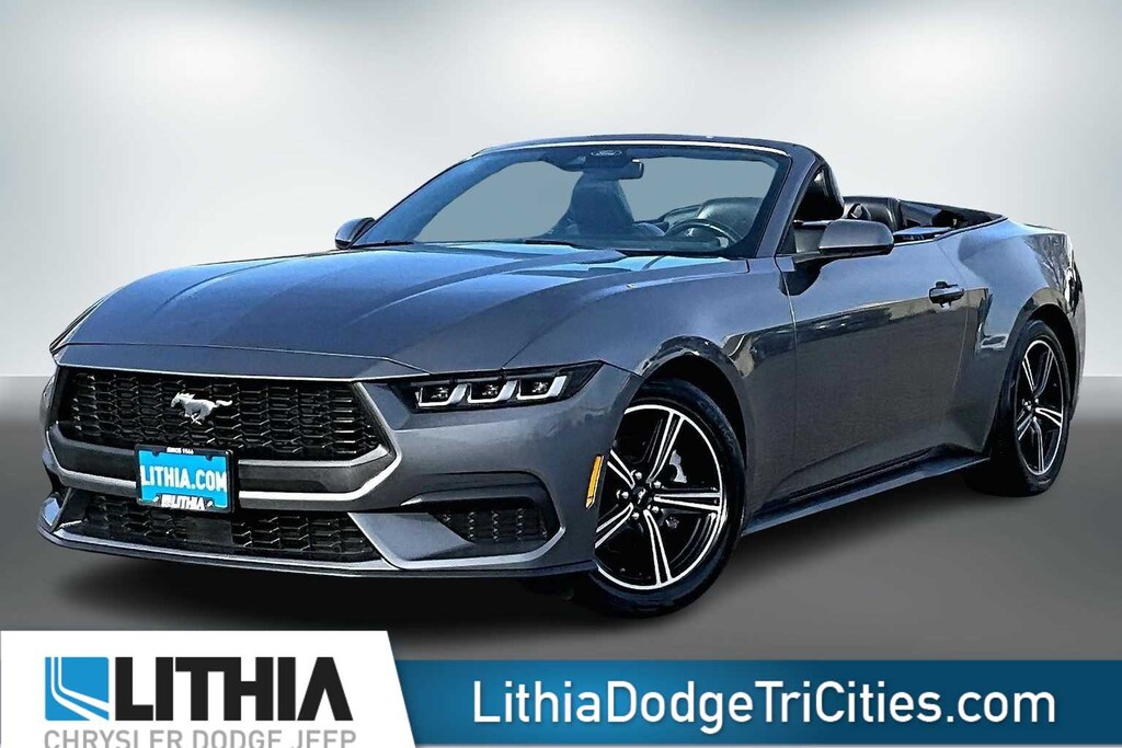 Lithia Chrysler Dodge Jeep Ram of Tri-Cities is pleased to offer this Gray Metallic 2024 Ford Mustang EcoBoost Premium for purchase, this vehicle is well equipped with many features including:4-Wheel Disc Brakes, 9 Speakers, ABS brakes, Air Conditioning, Alloy wheels, AM/FM radio: SiriusXM with 360L, AM/FM Stereo, Auto High-beam Headlights, Automatic temperature control, Brake assist, Bumpers: body-color, Compass, Convertible roof lining, Delay-off headlights, Driver door bin, Driver vanity mirror, Dual front impact airbags, Dual front side impact airbags, Electronic Stability Control, Emergency communication system: 911 Assist, Exterior Parking Camera Rear, Four wheel independent suspension, Front anti-roll bar, Front Bucket Seats, Front Center Armrest, Front dual zone A/C, Front reading lights, Fully automatic headlights, Glass rear window, Heated front seats, Illuminated entry, Knee airbag, Leather Shift Knob, Low tire pressure warning, Occupant sensing airbag, Outside temperature display, Overhead console, Panic alarm, Passenger door bin, Passenger vanity mirror, Power convertible roof, Power door mirrors, Power driver seat, Power steering, Power windows, Radio data system, Rain sensing wipers, Rear anti-roll bar, Rear Parking Sensors, Rear window defroster, Remote keyless entry, Security system, Speed control, Speed-sensing steering, Speed-Sensitive Wipers, Sport steering wheel, Steering wheel mounted audio controls, SYNC 4.0 QNX, Tachometer, Telescoping steering wheel, Tilt steering wheel, Traction control, Trip computer, Variably intermittent wipers, Voltmeter, and Wheels: 18 x 8 Machined-Face Aluminum. 2024 Ford Mustang EcoBoost Premium